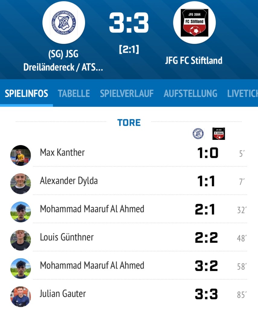 In der Folgezeit erspielten sich die die JFG FC Stiftland Jungs Chancen im Minutentakt. In der 82. Minute verweigerte der Unparteiische den Gästen einen glasklaren Foulelfmeter. Nicht schlecht staunten die JFG FC Stiftland Verantwortlichen in der 85. Spielminute als Julian Gauter das Leder aus gut 22 Metern unhaltbar ins Dreieck donnerte und das 3-3 erzielte. Dabei blieb es bis zum Schlusspfiff.